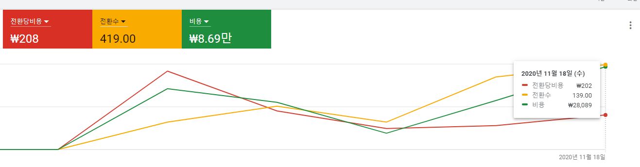 - 그런데 전환 수, 전환당 단가가 올라갔다. 즉, 광고 노출 환경에 관련한 그날 상황에 따라서 광고 성과가 달라진다. 전환당 단가와 전환 수가 반드시 비례하는 것은 아니지만, 어느 정도 상관관계 그래프를 그린다.