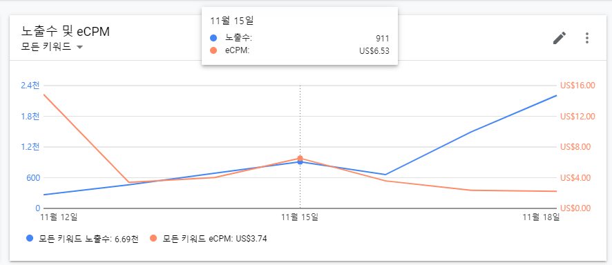 여담으로, 구글 애즈에서의 전환 수와 Admob에서의 eCPM은 반비례했습니다. 마찬가지로 구글 애즈에서의 CPA와 Admob에서의 eCPM은 비례하였습니다.